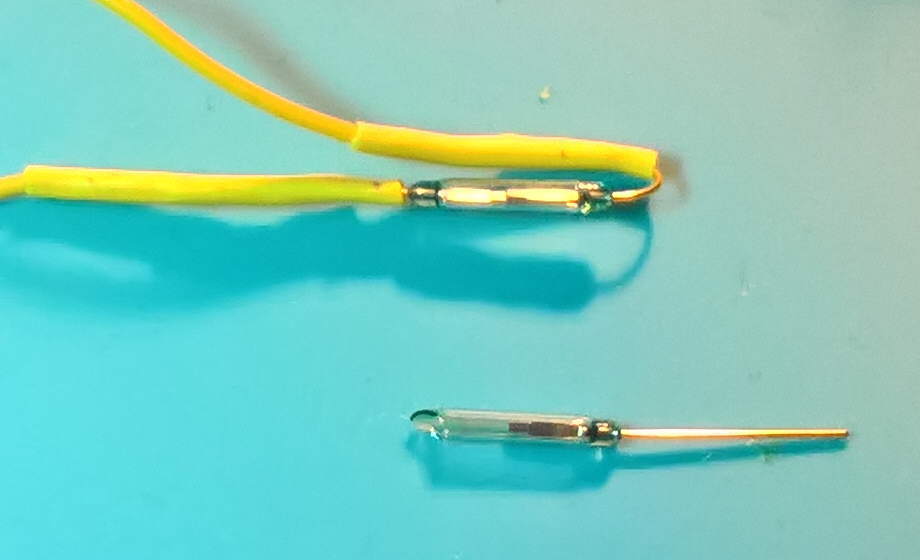 dachte ich mir, und machte mich auf zum Elektronikhändler, der zum Glück ein paar solche Glasröhrchen mit den kleinen Magnet-Sensor-Drähtchen auf Lager hatte. Je nach Größe waren zwischen 2 und 4 Euro angeschrieben. Zur Sicherheit nahm ich 1x klein, 2x mittel und 1x groß, damit man was zu Hause auf Lager hat.
