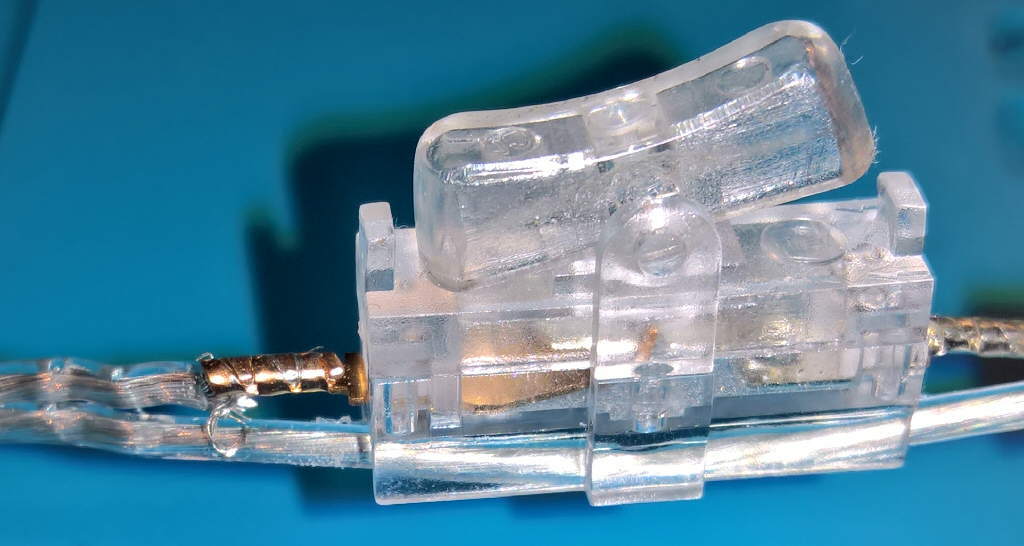 Und schon sah ich, dass auf einer Seite der Draht fast durchgerissen war. Nur wenige Litzen waren im Schalterkontakt eingeklemmt.